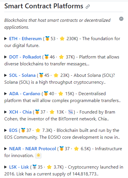 Şaşırtıcı olmayan bir şekilde, en yüksek puan Ethereum (ETH)’ air. Ethereum, tüm altcoin’ler arasında ikinci en büyük market hacmine sahip olan lider akıllı sözleşme platformudur. Ethereum, 230.000’den fazla yıldızla Masuch’un metodolojisine göre 53 puan aldı. Ethereum’un puanı, bu önceki raporda gösterildiği gibi Bitcoin’den (BTC) bile daha yüksek.