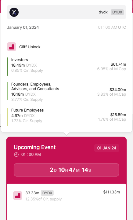 Bu token kilidini açma fantezisinde başı çeken, merkezi olmayan borsa güç merkezi dYdX (DYDX). Piyasa verilerine göre, dYdX ekibi 1 Ocak’ta 33,3 milyon DYDX tokenını piyasaya sürmeye hazırlanmakta. Bu da, yazının yazıldığı sırada 111,33 milyon dolarlık bir piyasa değerini temsil ediyor. Bu önemli sürüm, dYdX’in dolaşımdaki arzının %12,36’sını oluşturmakta. Zira bu durum, hem yatırımcılar hem de meraklılar için bir odak noktası haline geliyor.