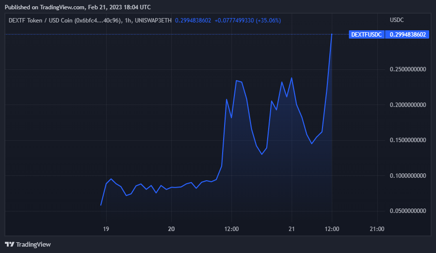 CMC verilerine göre, DEXTF fiyatı gün içinde 5x’in üzerinde değer kazandı. Şu anda son 24 saatlik kazancını %1,000 civarında tutuyor.