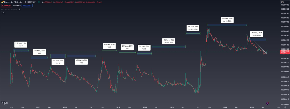 Kaleo ayrıca BTC/DOGE kurunu inceleyerek potansiyel fiyat hareketleri hakkında sonuçlar çıkarmak için tarihsel döngüleri inceliyor. Fiyat pump hareketlerinin zirvesinden zirvesine kadar çeşitli tarih aralıklarını analiz ediyor. Ayrıca 200-250 günlük aralığı takip eden bir hareket garanti olmasa da, geçmişte makul bir bahis olduğunu öne sürüyor. Bu analiz, Bitcoin ve altcoin Dogecoin arasındaki ilişkiyle ilgilenen yatırımcılar için değerli bir bilgi.