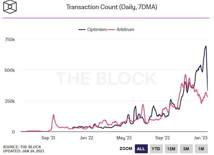 Ethereum için bir ölçeklendirme çözümü olan Optimism’teki işlem hacimleri, daha önceki büyük bir artışın ardından %70 düştü. Blockchain kaşifi Blockscan’in verilerine göre, günlük işlemler 12 Ocak’ta günde yaklaşık 800.000 işlemle zirve yaptıktan sonra 238.000’e geriledi.