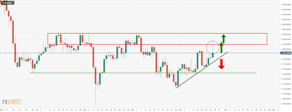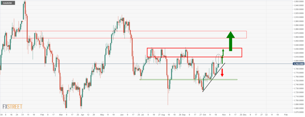 Uzmanlara göre altın fiyatı boğaların konsolide olduğu ve nihayet haftanın ikinci bölümünde yukarı yönlü bir kırılma yaptığı dinamik bir haftalık/günlük trend çizgisi tarafından desteklendi. Fiyat 1.800 dolarlara taşındı ancak şu ana kadar haftalık trend çizgisi direncini alamadı. Peki, grafikler neleri gösteriyor? Kriptokoin.com olarak altın analisti Ross J. Burland’in analizini paylaşıyoruz…