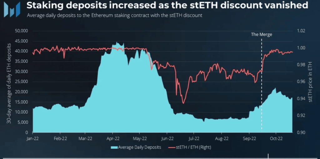 Grafiğe bakan Messari analistlerinden biri, “stETH indirimi neredeyse tamamen ortadan kalktı” diyor. Merge sonrası kırmızı çizginin belirgin artışında görülen durum aslında buydu. Yazım sırasında, stETH/ETH 0,995’te kaldı ve 1’lik başa baş oranına kapandı.