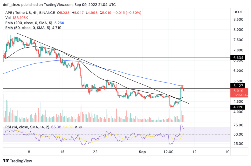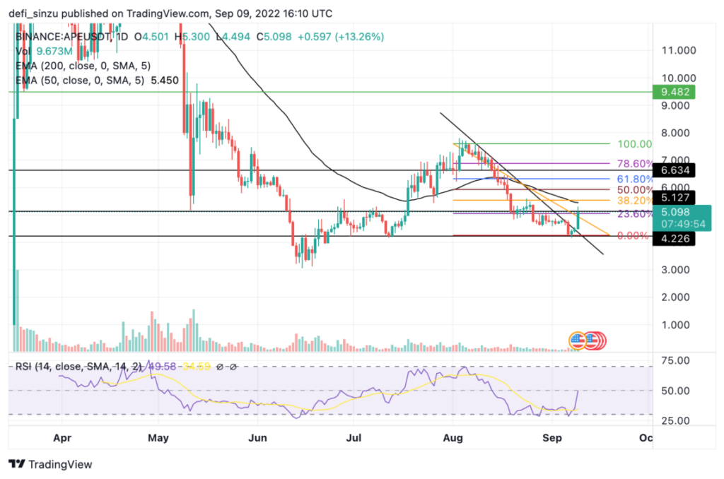 APE fiyatı haftayı alıcılar ve satıcılar arasında kararsızlıkla kapattı. Bir analist olan James Obande’e göre yeni haftanın daha fazla yükseliş görünümü ile bu, toparlanma gücünü gösteriyor. Analiste göre APE’den gelen bu ivme ile fiyatın dirençle karşılaşacağı 7.5 dolar işaretini tekrar ziyaret edebiliriz. APE’in fiyatı 4 dolara düştüğü için fiyatı 7.5 dolardan ret yedi. Bunun ardından sıçrama yaşadı ve 5.1 dolara yükseldi. Bu noktada 5.4 dolarlık direnç ile karşılaştı.