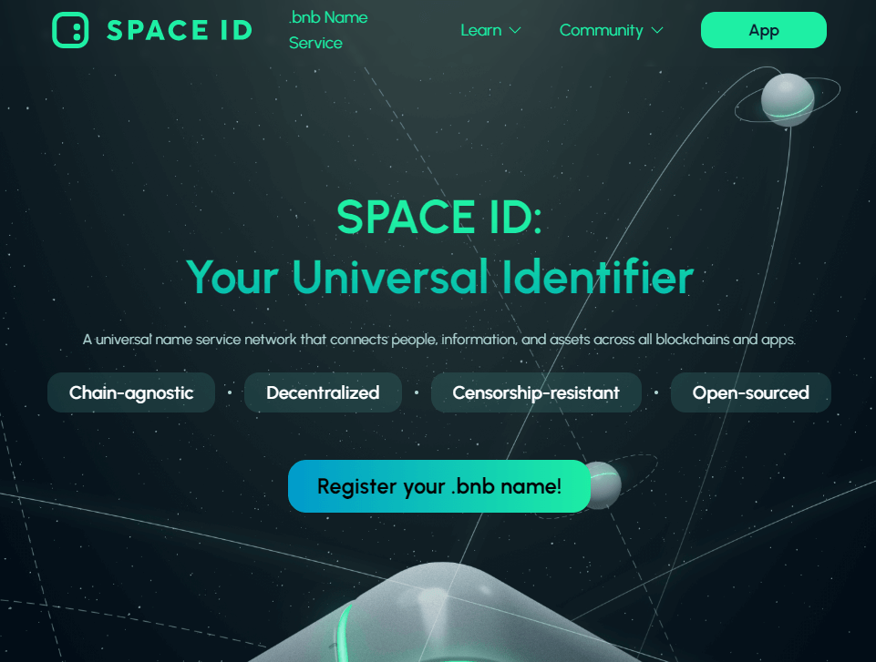 Space ID, merkezi olmayan, sansüre dayanıklı ve açık kaynaklı evrensel tanımlayıcılar oluşturuyor. Tüm Web3 etkileşimleri için karmaşık adresleri okunabilir bir kimlikle değiştirmeye olanak tanıyor. SPACE ID’nin ilk sürümü .bnb alan adıyla başlar. SPACE ID’nin ana ürünü, herhangi bir Blockchain’de işlem başlatabilen evrensel bir domain’dir.