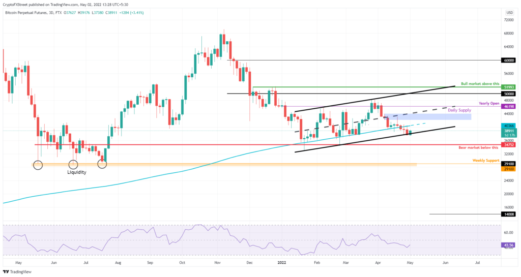 BTC fiyatı son üç aydır paralel bir kanalda yükselerek işlem görüyor. Ancak mevcut yeniden test, 200 SMA’ya yavaşça nüfuz ederek alıcıların azaldığını gösteriyor. Daha önce işlediğimiz üzere, üç günlük grafikte yükselen bir mum çubuğu alıcıların aktif kaldığını gösterir. BTC’nin hala 200 üç günlük SMA’yı aşması ve 42.153 ila 43.981 dolar arasında değişen günlük tedarik bölgesine ulaşması gerekiyor. Artışın arz bölgesi çevresinde sınırlı olması ve %9’luk bir artışa işaret etmesi bekleniyor.