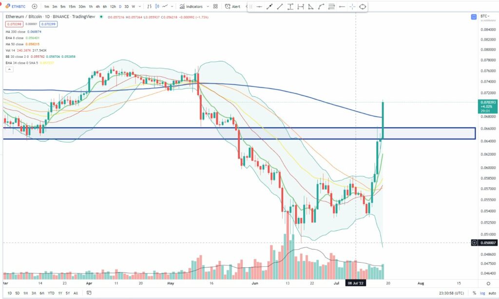 ETH şu anda son 24 saate +%3,54 ile 1,595.51 dolardan işlem görüyor. Grafik uzmanı, kendi görüşüne göre Ethereum’un şu anda BTC’den daha güçlü göründüğünü belirterek BTC/ETH çifti ile devam ediyor. Ek olarak, ETH’nin hala bir varlığın zaman içindeki fiyat ve oynaklık dalgalanmalarını ölçmek için kullanılan bir metrik olan üst Bollinger bantlarının (BB) üzerinde olduğuna dikkat çekiyor: