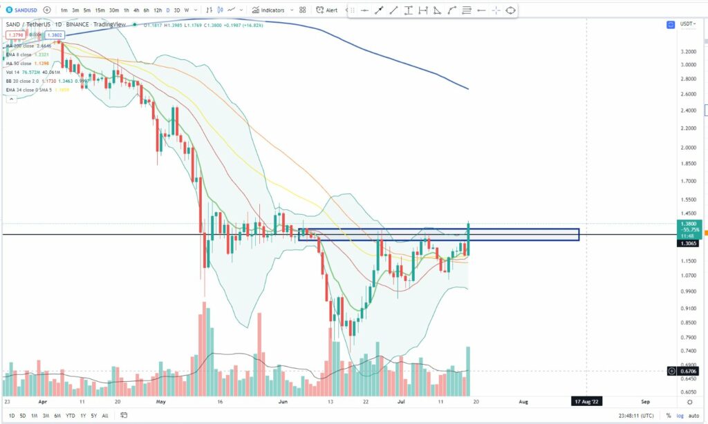 Piyasa değerine göre en büyük 36.kripto para birimi olan SAND yazım sırasında düşüşteydi. Cheds’in tahminlerine göre SAND bu bölgede bir süre mola verecek. Bu arada, metaverse coin’in mevcut piyasa ivmesine eşlik etmediğini belirmek gerekiyor.