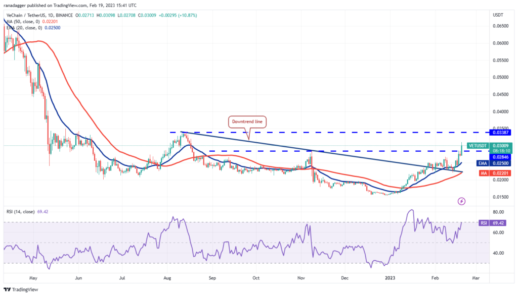 VeChain, düşüş trendi çizgisinin yeniden testini başarıyla tuttu ve ardından genel direncin üzerine çıkarak ayıların hakimiyetini kaybediyor olabileceğini gösterdi. Bu, boğaların üstünlüğe sahip olduğunu gösteriyor. Alıcılar bir sonraki geri çekilme sırasında 0,028 dolar seviyesini desteğe çevirirse, VET/USDT paritesi 0,034 dolardaki bir sonraki genel dirence doğru yükselebilir.