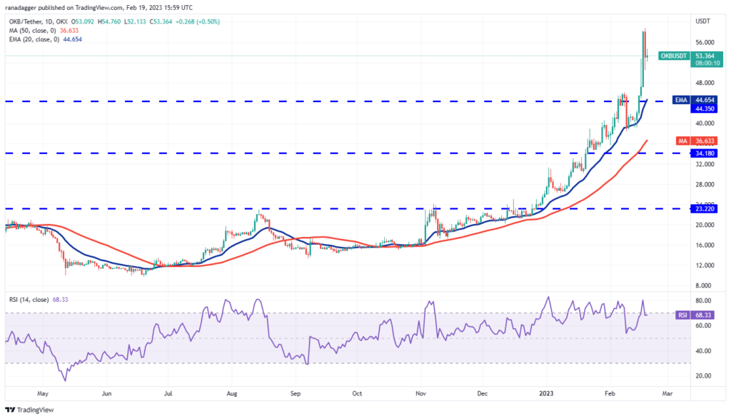 OKB/USDT çifti 18 Şubat’ta geriledi ve kârın 58 doların üzerinde olduğunu gösterdi. Güçlü bir yükseliş trendinde, düzeltmeler genellikle üç ila beş günden fazla sürmez. Fiyat 50 dolardan yükselirse, boğalar pariteyi 59 doların üzerine çıkarmaya çalışacak. Başarılı olurlarsa, parite 70 dolara doğru yolculuğuna başlayabilir. Alıcılar bu seviyeyi desteğe çevirirse, parite birkaç gün için 45 ila 58 dolar arasında konsolide olabilir. Ayılar, üstünlük elde etmek için altcoin fiyatı 44 doların altına düşürmek zorunda kalacak.