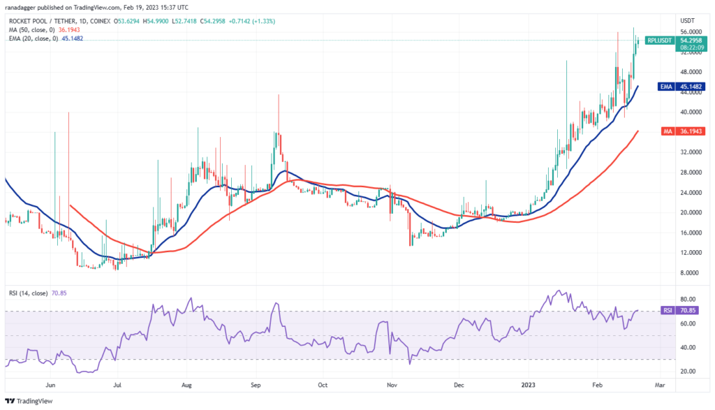 Rocket Pool (RPL) son birkaç gündür yükseliş trendinde. Geri çekilmeler sırasında fiyat 20 günlük EMA’nın (45 dolar) altına düşmedi, bu da daha düşük seviyelerde alım için güçlü talebi gösteriyor. 18 ve 19 Şubat’taki gün içi şamdan modeli, ayıların yükseliş trendini 56 dolar civarında durdurmaya çalıştığını ancak boğaların avantajlarından vazgeçmeye istekli olmadığını gösteriyor. Alıcılar fiyatı 57 doların üzerine çıkarırsa, RPL/USDT bir sonraki hedef olan 74 dolara doğru ilerleyebilir.