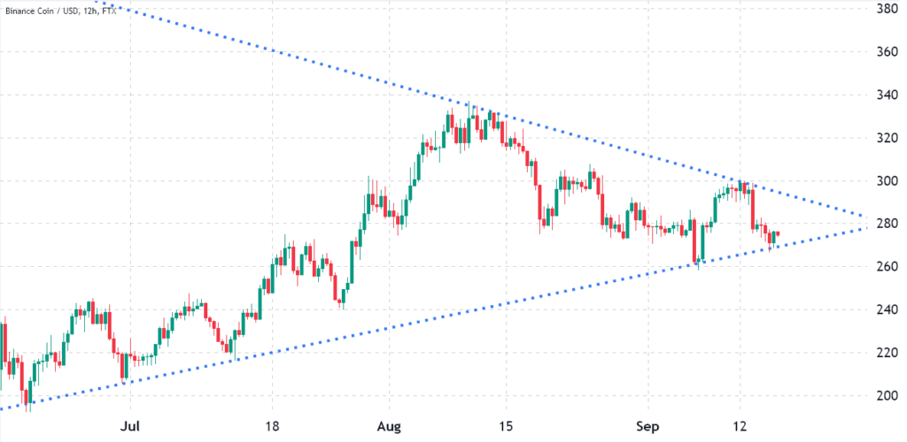 Binance’in yerel kripto para birimi BNB, 335 dolar direncinde azalan trend çizgisiyle ilk karşılaştığında 10 Ağustos’ta simetrik bir üçgen oluşumuna girdi. Takip eden beş hafta, iki çelişen artan ve azalan model arasındaki tam kesişme noktası olan 280 dolar civarında bir mücadele oldu.