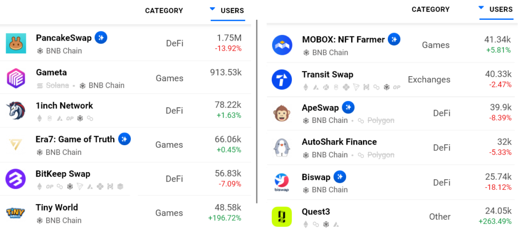 BNB Chain’in merkezi olmayan borsası PancakeSwap, 1,75 milyon aktif adrese sahiptir. Bununla birlikte tüm akıllı sözleşme ağlarında mutlak liderdir. Bu arada, Ethereum ağı yalnızca üç DApp’e sahiptir. Bunlar Uniswap, OpeanSea ve MetaMask Swap olmak üzere 35.000’den fazla aktif adres barındırır. Daha da önemlisi, BNB Chain kullanan üç DApp, %190 veya daha yüksek bir oranda büyüdü. Gameta 900.000’den fazla aktif adresle en umut verici olanı oldu.