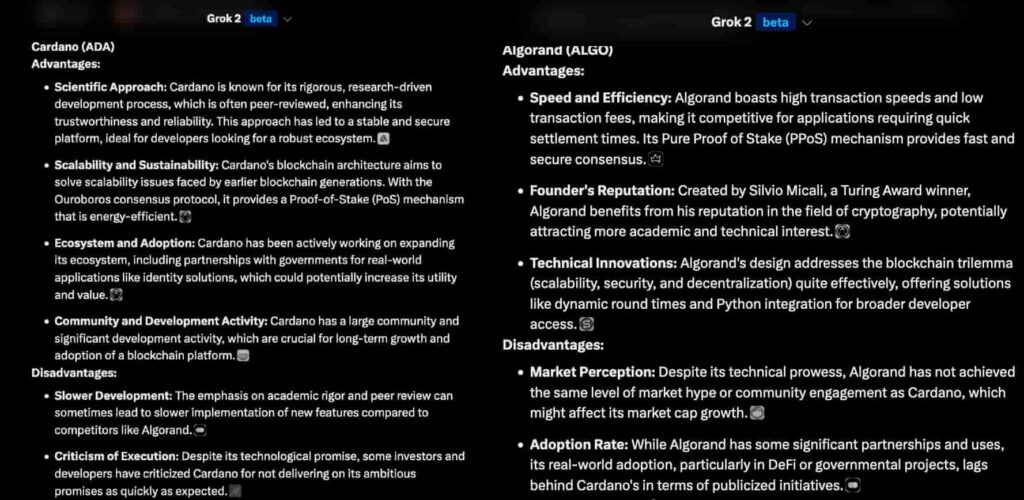 İlginç bir şekilde, Grok, Cardano’nun titiz hakemli araştırma odaklı geliştirme sürecine işaret ediyor. Ayrıca Algorand’ın kurucusu Silvio Micali’nin Turing Ödülü sahibi olarak ününü kabul ediyor. AI sözcükleriyle, bu faktörler kriptografi alanında akademik ilgi çeken iki sağlam projeye katkıda bulunuyor. Ayrıca, xAI’nin modeli, her iki zincirin ölçeklenebilirliğini ve sürdürülebilirliğine işaret etti. Bunun, alana teknik yenilikler getiren temel avantajlar olarak belirtti. Ancak, Grok’a göre, Algorand daha yüksek hız ve verimlilik sunmakta. Diğer yandan Cardano daha yüksek benimseme ve daha aktif bir toplulukla gelişiyor. Dezavantajlara gelince, Cardano rakiplerine kıyasla vaatlerinin yavaş geliştirilmesi ve uygulanmasından muzdarip. Öte yandan Algorand, Grok AI kaynaklarına göre yavaş bir benimsenme oranı ve pazar tanınırlığından muzdarip.
