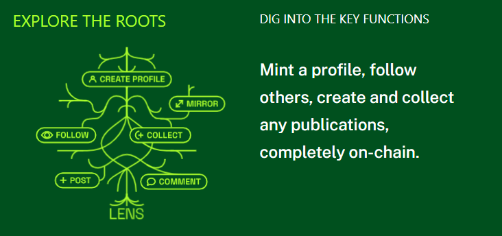Lens’in tasarımı, sosyal medya işlevselliğini bir Web3 bağlamında ve Blockchain teknolojisi, akıllı sözleşmeler ve NFT’ler temelinde çoğaltır. Böylece, ağ kullanıcılarının profilleri vardır; farklı türde içerikler yayınlayabilir, paylaşabilir ve yorum yapabilir, arkadaşların ve kanaat önderlerinin profillerini takip edebilirler.