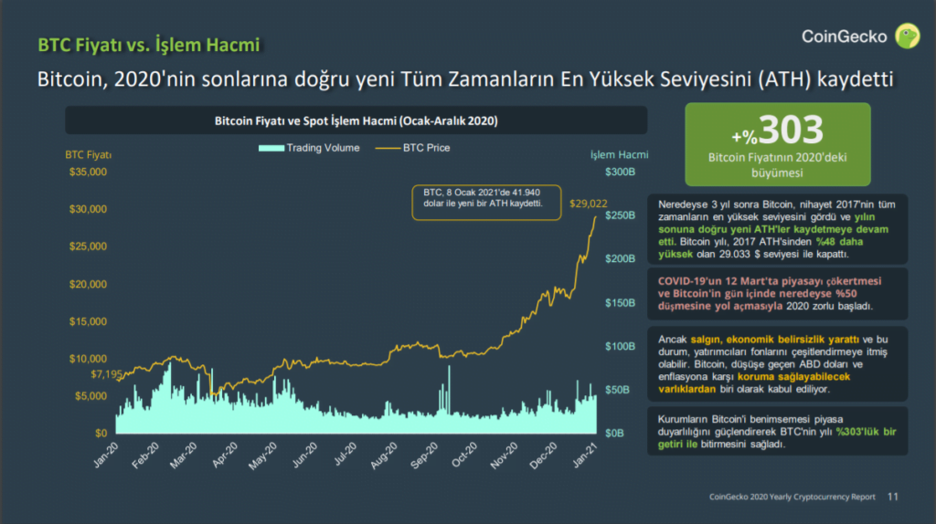 “Kripto para piyasasına genel bakış” kısmında piyasa değerine göre ilk 5’te yer alan kripto para birimlerinin 2020 yılı boyunca sağladığı getiri, coin’lerin hakimiyeti ve stablecoin’lere yer verildi. Öte yandan Bitcoin analizinde ise önde gelen kripto para biriminin kırdığı rekor ile birlikte 2016-2017 ile 2020-2021 döngülerinin karşılaştırmasına yer verildi.