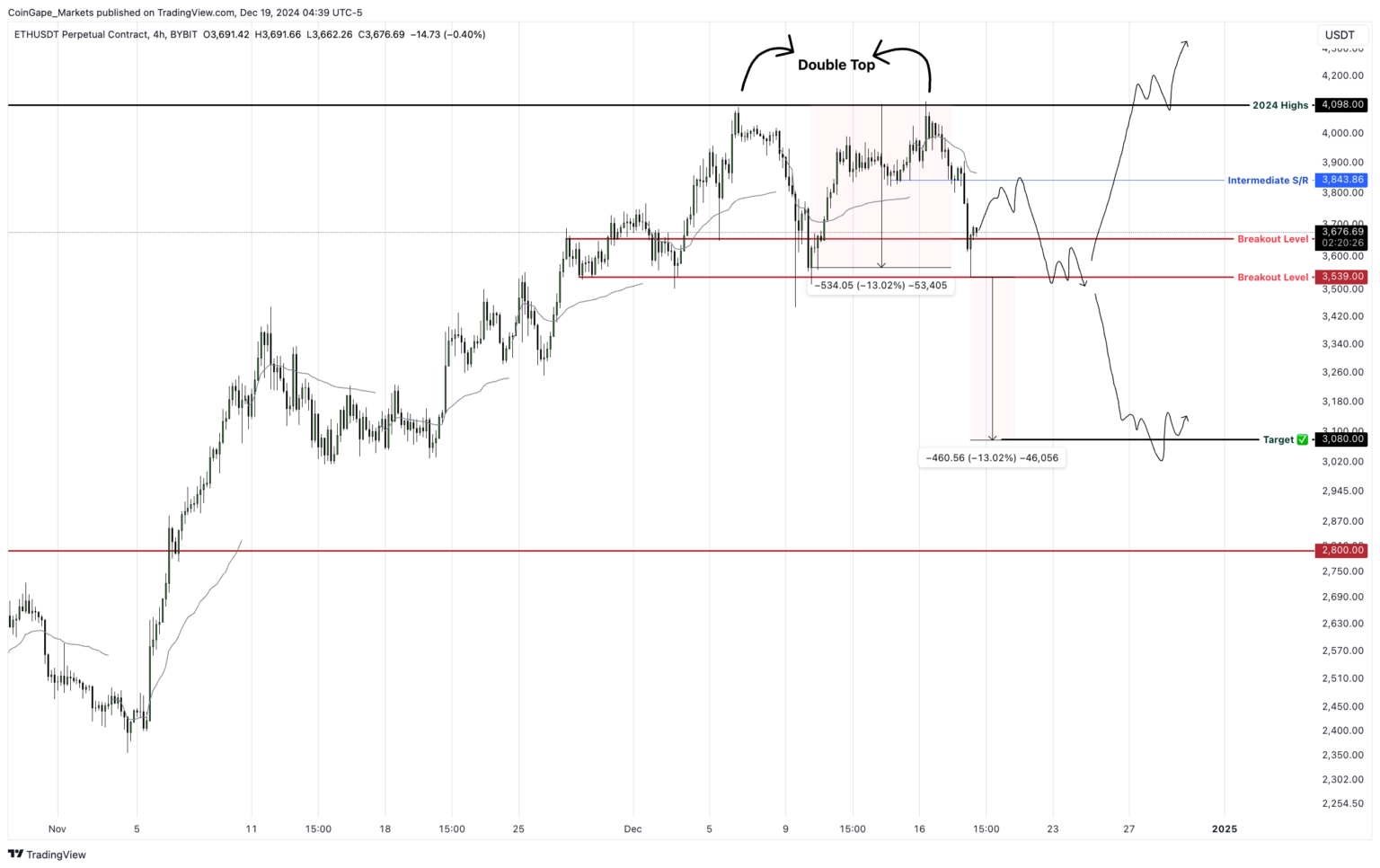 The FOMC-induced crash led to a double-top pattern forming on Ethereum’s chart. This technical formation is regarded as a sell signal, indicating a potential reversal of the previous uptrend. After rising by 11% in December to a yearly peak of $4,111, Ethereum’s price experienced a sharp 14% decline to $3,583, completing the double-top pattern. A break below the $3,656 and $3,539 support levels could confirm the pattern, potentially pushing ETH down by 13% to $3,080.