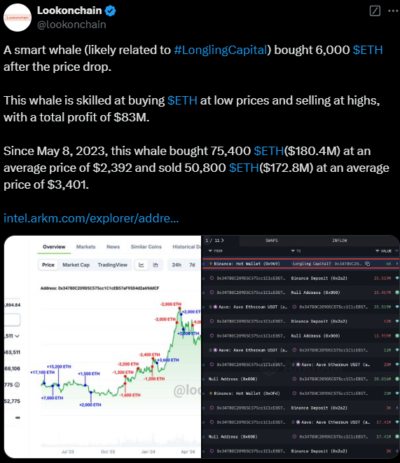 Chinese investment firm Longling Capital has once again seized the opportunity presented by the recent correction in the altcoin market. Following Bitcoin’s local peak at $106,000 and subsequent decline, the altcoin market mirrored this downtrend. Longling Capital reacted swiftly, purchasing 6,000 ETH after Ethereum’s price dropped. Known for buying low and selling high, the whale has reportedly amassed a total profit of $83 million. Its notable trading activity since May 8, 2023, continues to draw attention.