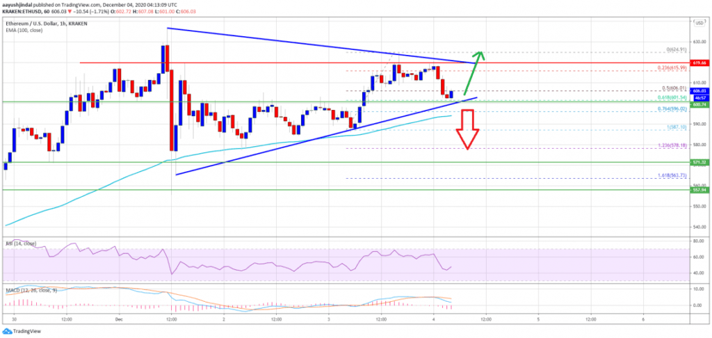 600 dolarlık direnci kırdıktan sonra Ethereum fiyatı  istikrarlı bir artış yaşadı. ETH fiyatı 610 dolar seviyesini bile kırdı ve 100 saatlik basit hareketli ortalamanın üzerine çıktı. Aşağı yönlü bir düzeltmeye başlamadan önce ETH, 625 dolarlık dirence yakın işlem gördü. 624 dolar civarında bir yüksek seviye oluştu ve fiyat 615 doların altına düştü.