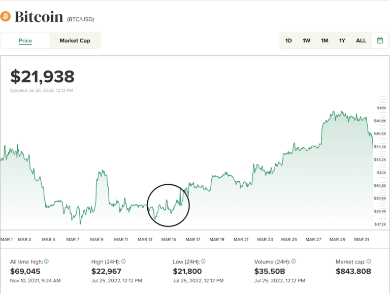 Bitcoin’in fiyatı, yeniden yükselmeden önce Fed’in bu yılki ikinci toplantısıyla aynı hafta olan 13 Mart haftasında kısaca düştü. Fed, 2018’den bu yana ilk artış olan yüzde 0.25’lik faiz artışını onayladı.