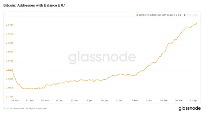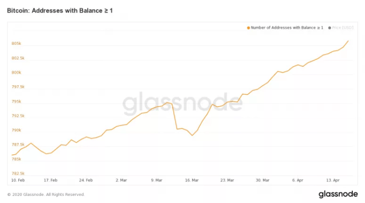 Blockchain istihbarat firması Glassnode tarafından sağlanan verilere göre, en az bir Bitcoin içeren farklı adreslerin sayısı, yedi gün içinde 16 Mart’a kadar 795.140’dan 789.399’a düştükten sonra 16 Nisan’da 805.805’e yükseldi. Bu süre zarfında, Bitcoin’in fiyatı 9.000 dolardan 4.000 dolara düştü.