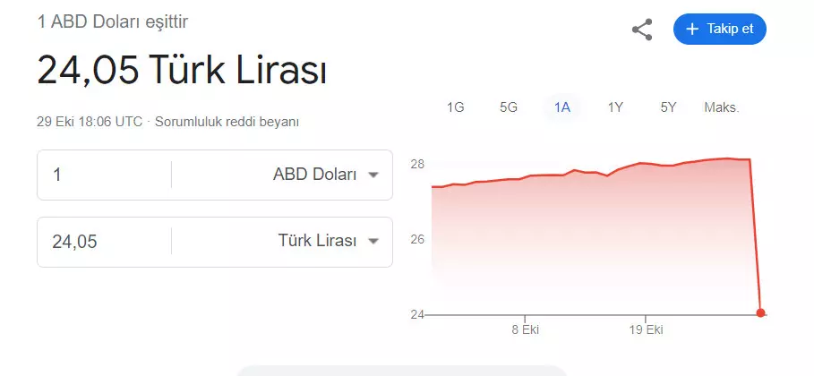Dün gece geç saatlerde, dünya genelinde piyasalar kapanırken, Google’da dolar kuru araması yapan kullanıcılar şaşırtıcı bir manzarayla karşılaştı. Haftayı 28 TL’den kapatan Dolar/TL kuru, popüler arama motorunda açıklanamaz bir şekilde 24 TL olarak göründü. Piyasa kurundan 4 TL’lik bu ani ve beklenmedik düşüş, elbette hemen dikkat çekti. Özellikle, kripto para topluluğu da dahil milyonlarca kullanıcıyı şaşkınlığa uğratarak sosyal medyada hızla gündem oldu. Yaygın endişeye rağmen, Google’ın bir önceki işlem gününde resmi olarak 28 lira 16 kuruştan kapanan doları neden 24,05 Türk Lirası olarak gösterdiğini açıklayan resmi bir açıklama yapılmadı. Bu tutarsızlığın Google’ın veri altyapısındaki sistemsel bir hatadan kaynaklandığı düşünülmekte.