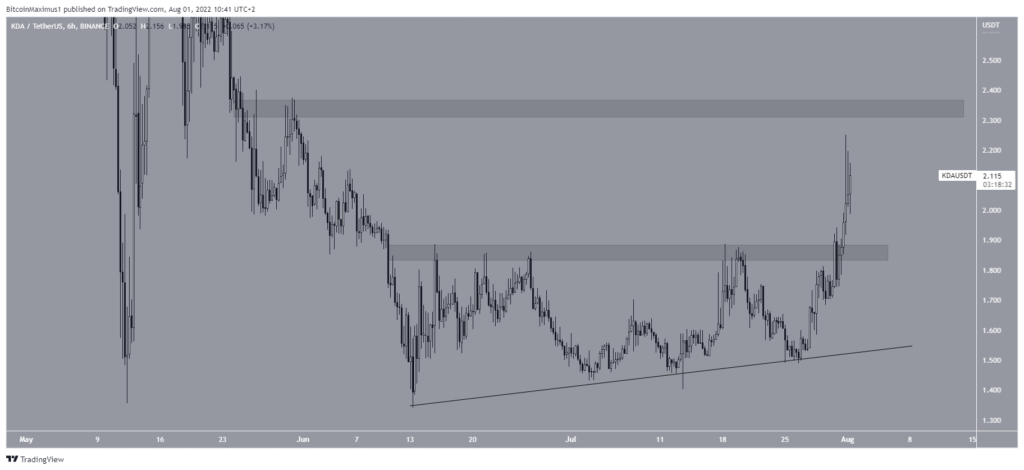 Teknik kısımda, KDA fiyatı 13 Haziran’dan bu yana yükselen destek çizgisi ile beraber yükseliyor. Kritik dirençlerinden biri 1,90 dolarda yer alıyor. Yukarıdaki görüldüğü üzere bu bölgede bir üçgen yapısı oluşturdu. Bu formasyon, genellikle yükseliş yapısı olarak görülmektedir. KDA fiyatı şimdiye kadar 31 Temmuz’da bu formasyondan çıkmayı başardı. 2,25 dolara kadar uzanan koşu, 2,35 dolardaki dirençle sınırlanıyor.