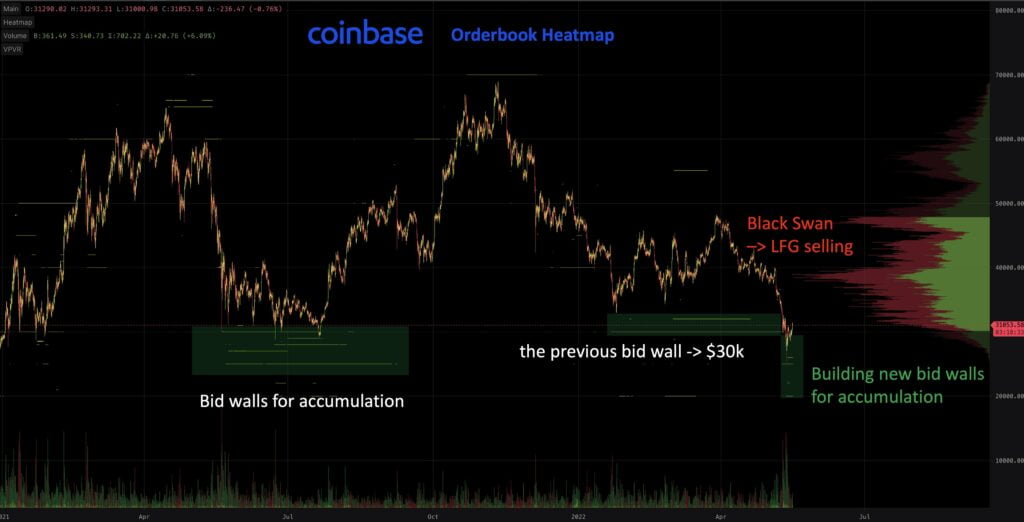 Coinbase için BTC-USD emir defteri ısı haritasını görürseniz, Mayıs 2021’deki son ayı piyasasından bu yana oldukça kalın emir duvarları var. Bence kurumlar 30 bin dolardan BTC biriktirmeye çalıştı ancak beklenmedik LFG satışları nedeniyle teklif duvarlarını 25 bin dolardan yeniden inşa etmek zorunda kaldı.