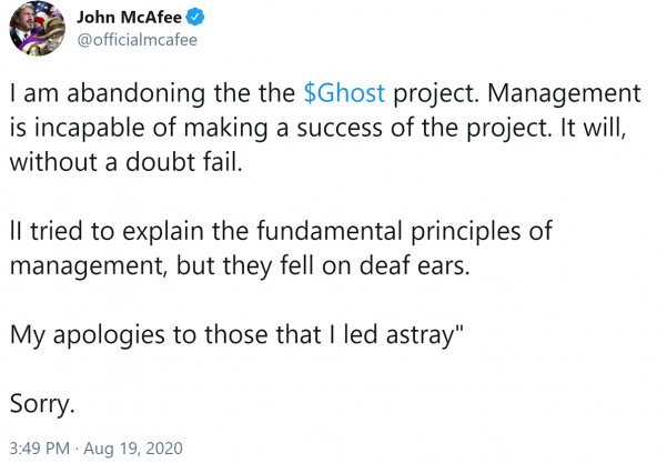 Kriptokoin.com – Gizlilik odaklı bir kripto para birimi, bir borsa ve telefon hizmetini içeren Ghost ekosistemini inşa eden John McAfee; artık bu para birimini desteklemediğini açıkladı. Çarşamba günü attığı tweet’te “Ghost projesini terk ediyorum. Yönetim, projeyi başarıya ulaştırmaktan acizdir. Hiç şüphesiz başarısız olacaktır,” ifadelerini kullandı. Daha sonra “bu yola soktuğu” kişilerden özür diledi.