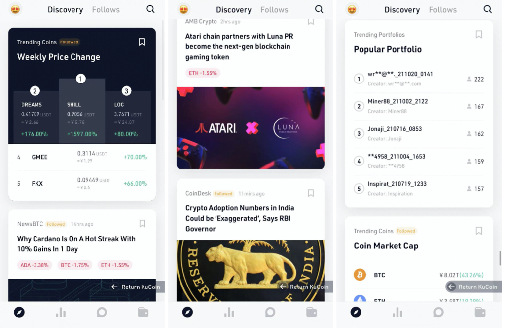 - Güvenilir kripto para haberleri: Çoğu kripto para traderı, genellikle FUD (korku, belirsizlik, şüphe) durumuyla karşılaşır ve bu anlarda yanlış yatırımlar yapabilir. Bir traderın gerçek olan bilgiyi bulması zaman alan bir şeydir. KuCoin S; fiyat hareketleri, yeni listelemeler, kripto haberleri, trend olan coin’ler, sektör, portföyler gibi çeşitli konularda güvenilir bilgiler sunar. Bu özelliklerin, yapay zeka tabanlı algoritmalar ve makine öğrenimi yoluyla kademeli olarak gelişmesi ve özelleşmesi planlanıyor.