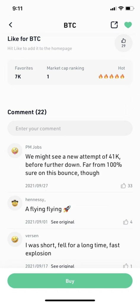 - Çok-yönlü sosyal özellikler: KuCoin S; beğenme, takip etme, yorum yapma ve paylaşma gibi sosyal özellikleri destekliyor. Belirli bir tokena olan desteğinizi gösterebilir, onu favori listenize veya portföyünüze ekleyebilirsiniz. Ayrıca trend olan bir token veya konu hakkında yorumlarınızı bırakabilirsiniz. Eylemleriniz ve görüşleriniz başkalarının daha iyi kararlar almasına yardımcı olabilir. Aynı şekilde, KuCoin’deki diğer milyonlarca kullanıcıdan fikir alabilirsiniz. Örneğin aşağıda, birkaç kullanıcının BTC hakkında düşündüklerini paylaştığını görebilirsiniz: