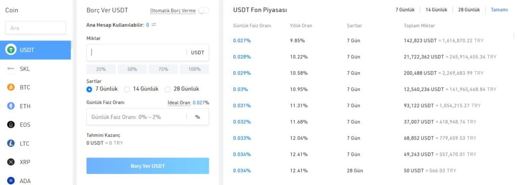 - KuCoin Crypto Lending, kullanıcıların pasif gelir elde etmek için varlıkları ödünç verebilecekleri bir eşler arası borç verme piyasası sunar. Örneğin USDT borç vermek istediğinizde aşağıdaki gibi bir sayfayla karşılaşırsınız: