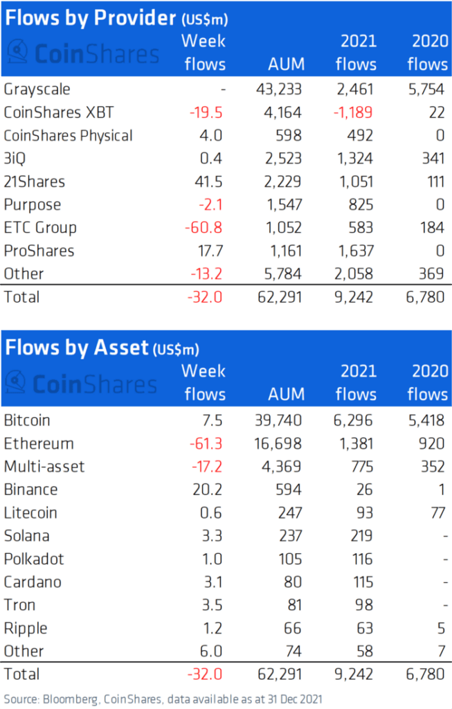 Girişler yeni rekorlar kırarken, 2021 ayrıca etkinliklerle dolu bir yılda en yüksek haftalık ve aylık çıkışlardan bazılarına sahip oldu. Ancak Bitcoin, çok etkili bir performans sergileyemedi. Yılın son haftasında 32 milyon dolarlık çıkış görüldü. Bu, toplam 228 milyon dolarlık çıkışla rekor kıran ilk üç haftadan daha düşüktü. Ethereum ise harika bir yıl geçirdi. Önde gelen altcoin girişleri 2020’de 920 milyon dolar iken 2021’de 1.3 milyar dolara çıktı. Ancak yukarıdaki tabloda da görüldüğü üzere bu hafta ETH’den belirli bir miktar çıkmış gibi görünüyor.