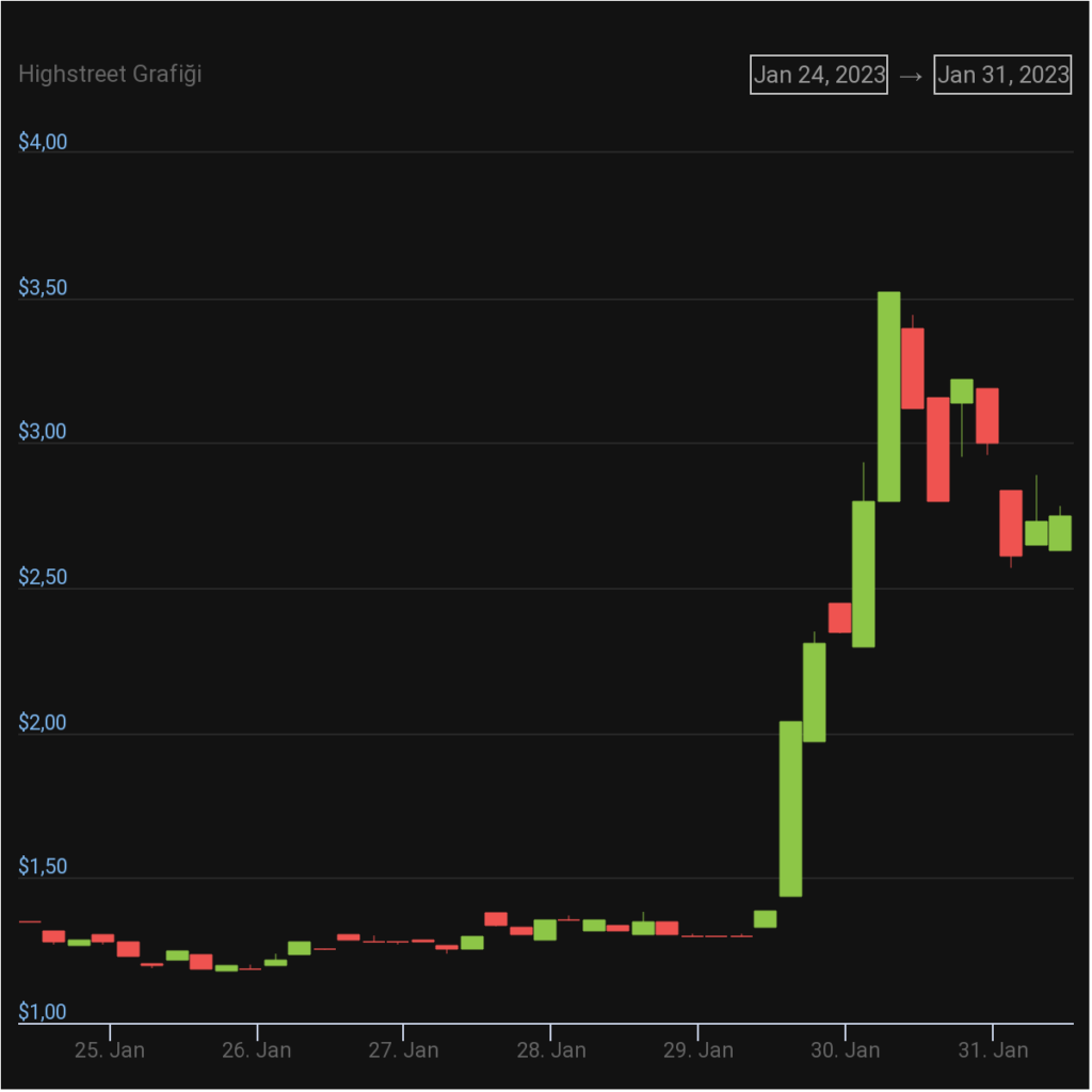 Kriptokoin.com olarak da bildirdiğimiz üzere HIGH, geçtiğimiz gün, Highstreet metaverse’ündeki NPC’lerin sohbet robotu ChatGPT desteğini alacağını açıklamıştı. Bu, kısa süreli bir yükselişe neden oldu. Coin, 1.30 dolar seviyelerinden 2.50 dolara kadar yükselmeyi başardı. Ancak, ardından, yükselişi durmadı ve 3.50 doların üzerine kadar çıktı. Veri platformu LookOnChain’e göre HIGH, Binance CEO’sunun açıklamalarının ardından değer kazanmaya devam etti.