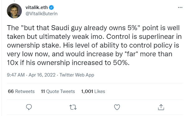 Açıklamalarının bir kısmında Twitter’ın en büyük hissedarlarından Suudi Prens El-Velid bin Talal’ı örnek veren Buterin şunları söylüyor: