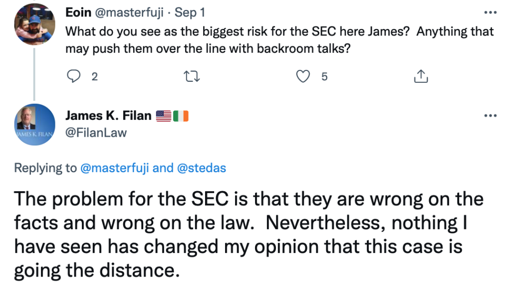 Savunma avukatı ve eski federal savcı James K. Filan, yakın tarihli bir tweet’te (yukarıda) SEC’in karşı tepkisinden oluşan belgelerin ekran görüntülerini paylaştı. Bir Twitter kullanıcısı tarafından sorulan “SEC için en büyük risk nedir James? Arka oda konuşmaları ile çizgiyi aşmalarına neden olabilecek herhangi şey var mı? Sorusuna, James K. Filan şu yanıtı verdi: