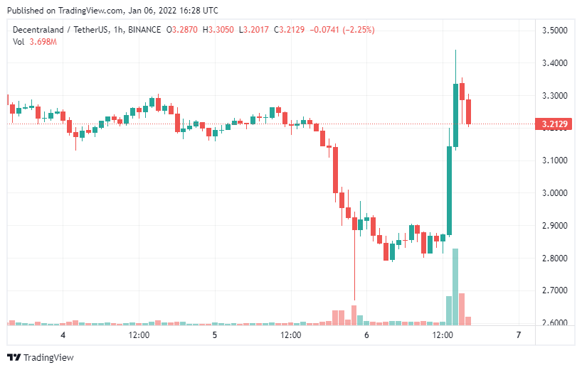 Kripto para piyasası, Aralık ayından bu yana düzeltici fiyat hareketleriyle mücadele ediyor. Son düşüş, Bitcoin’in fiyatından saatler içinde 4.000 dolar silerken, piyasa genelindeki düşüşlerin ortalaması %10’a ulaştı. Samsung haberinden önce MANA 2.73 dolardan işlem görüyordu. Duyuru ardından fiyat %20 yükselişle son 24 saatlik kazancını %2’ye ulaştırdı. Ethereum tabanlı metaverse yazım sırasında 3.21 dolardan işlem görüyor.