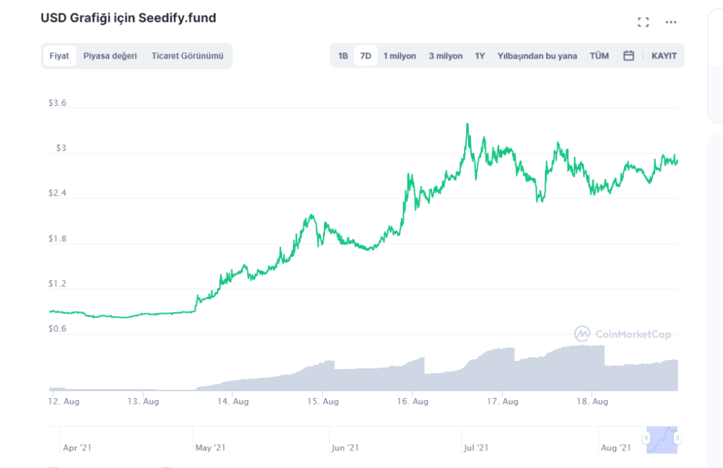 Şu anda, SFUND oldukça sağlam bir dalga sürüyor. 28 Mart 2021’de 0,79 dolardan işlem görmeye başladı. Mayıs ayında SFUND, sadece bir buçuk ay sonra 6.80 dolarlık etkileyici bir zirveye yükseldi. Bu rakamlar, aylar içinde altcoin fiyatının yüzde 750 yükseldiğini gösteriyor. Ancak kripto piyasasının geri kalanı gibi, Seedify Fund da hızla düştü ve sonunda Temmuz sonunda sadece 0.30 dolara kaydı. Dibe vurduktan sonra, SFUND yükseldi ve 3 doların üzerinde bir fiyata geri döndü.