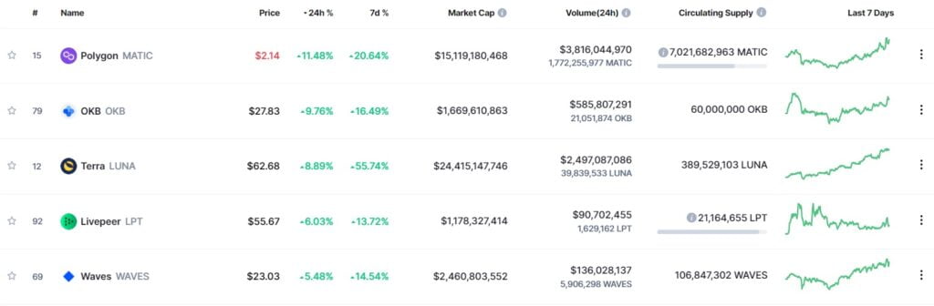 Üçüncü olarak, Terra’nın LUNA’sı yüzde 8.89 oranında yükseliş yaşadı. Terra, fiyat istikrarlı küresel ödeme sistemlerine güç sağlamak için fiat sabitli stablecoin’leri kullanan bir Blockchain protokolüdür. Whitepaper’ına göre Terra, fiyat istikrarını ve fiat para birimlerinin geniş çapta benimsenmesini Bitcoin’in (BTC) sansür direnciyle birleştirir ve hızlı ve uygun fiyatlı ödemeler sunar.  LUNA, bugün sabah saatlerinde  tüm zamanların en yüksek seviyesine ulaşarak 64.87 doları gördü. Son fiyat artışıyla piyasa değeri 25 milyar doları aştı ve Shiba Inu’nun yerini alarak on ikinciliğe yükseldi.