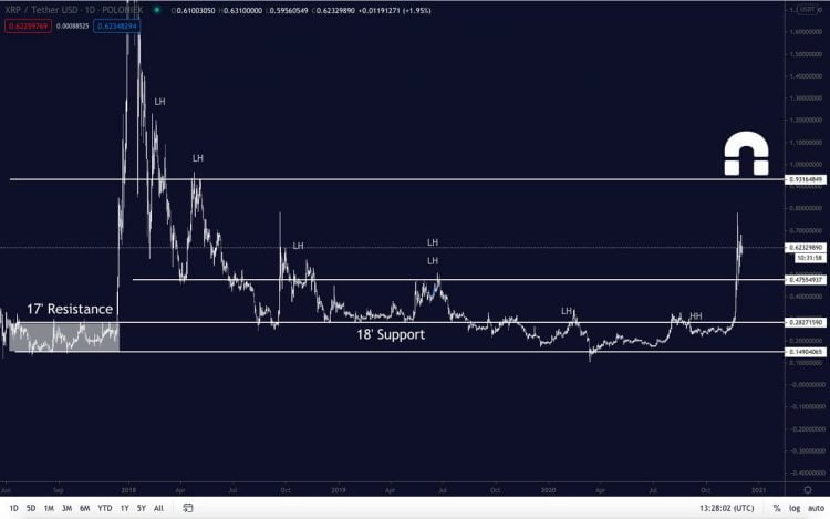 Kriptokoin.com – Ripple (XRP), son birkaç gündür sıkı bir konsolidasyon modeline yakalandı. Ayrıca boğalar, 0,65 dolarlık bölgedeki direncin üzerine çıkmaya çalışırken son parabolik ralli yavaşladı. Kripto para biriminin son rallisi, XRP’nin 0,20 ila 0,30 dolar arasında uzun süredir tutulan bir işlem aralığının üzerine çıkmasının ardından gerçekleşti. Kripto para biriminin toparlanmasını sağlayan önemli etkenlerden biri, Ripple’ın her çeyrekte kripto borsalarına XRP satmayı bırakmasıdır.