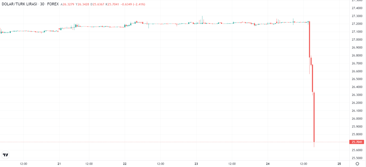 TCMB’nin faiz oranlarını yüzde 17,5’ten yüzde 25’e çıkartarak 750 baz puan artırmasının ardından Borsa İstanbul’da bankacılık endeksi sert bir şekilde değer kazanırken, dolar/TL paritesi ise yaklaşık yüzde 2 oranında değer kaybetti. Kararın açıklanmasından hemen önce 27,22 seviyesinde bulunan parite, sürpriz kararın açıklanmasının ardından 26,56 seviyesine kadar geriledi. Saatler ilerdikçe dolar/TL paritesinde değer kaybı da hızlandı. Saat 15:45 itibarıyla dolar/TL paritesi yüzde 5,80’e varan bir değer kaybıyla 25,56 seviyesinde bulunuyor.