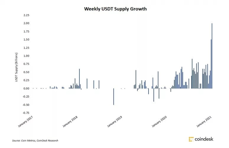 Kriptokoin.com – Tether (USDT), geçtiğimiz hafta iki milyar dolar destekli token bastı. Bu miktar, önde gelen stablecoin projesi için yeni bir rekor.