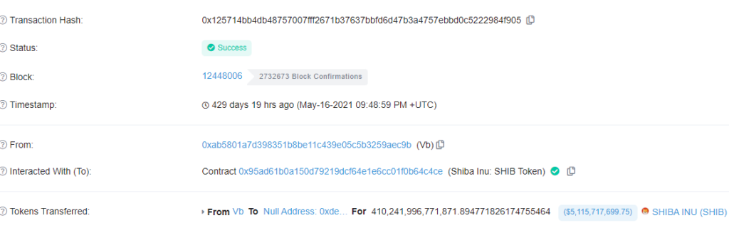 Vitalik daha sonra, Polygon kurucusu Sandeep Nailwal tarafından kurulan bir Hindistan COVID-19 yardım fonuna 50 trilyon SHIB bağışladı. Bu dolar bazında 1,2 milyar dolar civarındaydı. SHIB fiyatı daha sonra iki hafta içinde yaklaşık %900’lük bir fiyat artışı gördü. 10 Mayıs’ta tüm zamanların en yüksek seviyesi olan 0.00003791 dolara ulaştı. Ek olarak bu tarihlerde dünyanın en büyük borsaları olan Binance ve Huobi’nin listesine girdi.